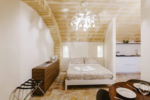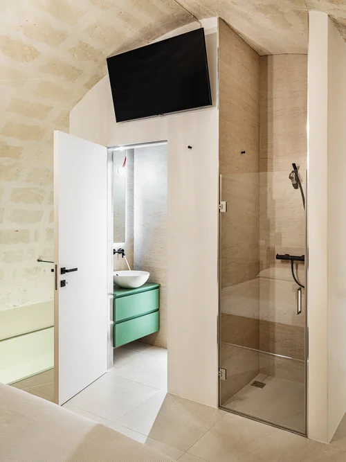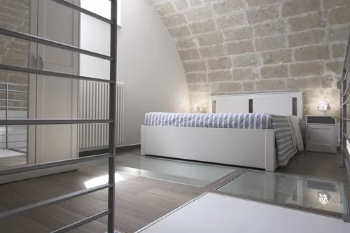 Il progetto di recupero, risanamento e design per un manufatto architettonico originario, o lamione, nei Sassi di Matera, curato dallo Studio Lomo, mira all'integrazione del design di progetto contemporaneo con l'antico, finalizzando lo studio dei caratteri distributivi interni al nuovo utilizzo turistico ricettivo. Il progetto si sviluppa su tre diversi livelli con camere da letto matrimoniali poste sulla parte terminale del lamione, a strapiombo sul canyon della murgia materana. La parte antistante del lamione si sviluppa invece a doppia altezza puntando ad una visione verticale conferita dell'architettura della scala, un foglio dorato che si avvolge intorno ad un camino a due fuochi, intorno al quale si sviluppano la zona pranzo con angolo cottura e il soggiorno. Il design contemporaneo integrato con il valore di testimonianza storica dell'ambiente orginario, delle superfici murarie e della volta in conci di tufo rivalorizza il linguaggio delle antiche architetture di tufo dei Sassi di Matera.